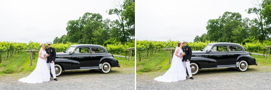 I am excited to share this recent military wedding held in Leesburg, Virginia. From the moment I met Shellie and Connor I knew their wedding in historic Leesburg, Virginia was going to be special. A ceremony was held at Saint John the Apostle Roman Catholic church, specifically the “little church” or Chapel of the Immaculate Conception which was the most adorable and understandably named “little” church. It was the perfect location for their military wedding. Shellie serves in the Navy while Connor is in the Marines. Along with a beautiful wedding service, the officiant shared stories of the couple and how they met while attending Virginia Tech, they were both looking for the chapel on campus. Following the ceremony and traditional sword ceremony exit, the couple rented a 1946 tuxedo black Chevrolet Fleetmaster which we took downtown for a few candid shots. Leesburg is hands down the cutest little town in northern Virginia and made for an amazing backdrop for wedding photos. Their reception was held at the Vineyards and Winery at Lost Creek. Lost Creek Winery was a gorgeous wedding reception location. We spent a few minutes with the bridal party and the Fleetmaster in the vineyards before heading to the Harvest House for the formalities. It was an absolute pleasure to celebrate with this couple and above all, thank you both for your service in the Navy and Marines!